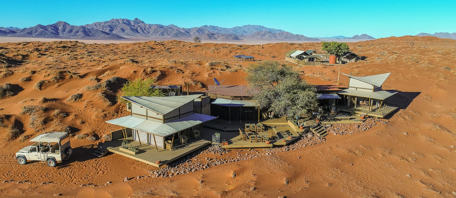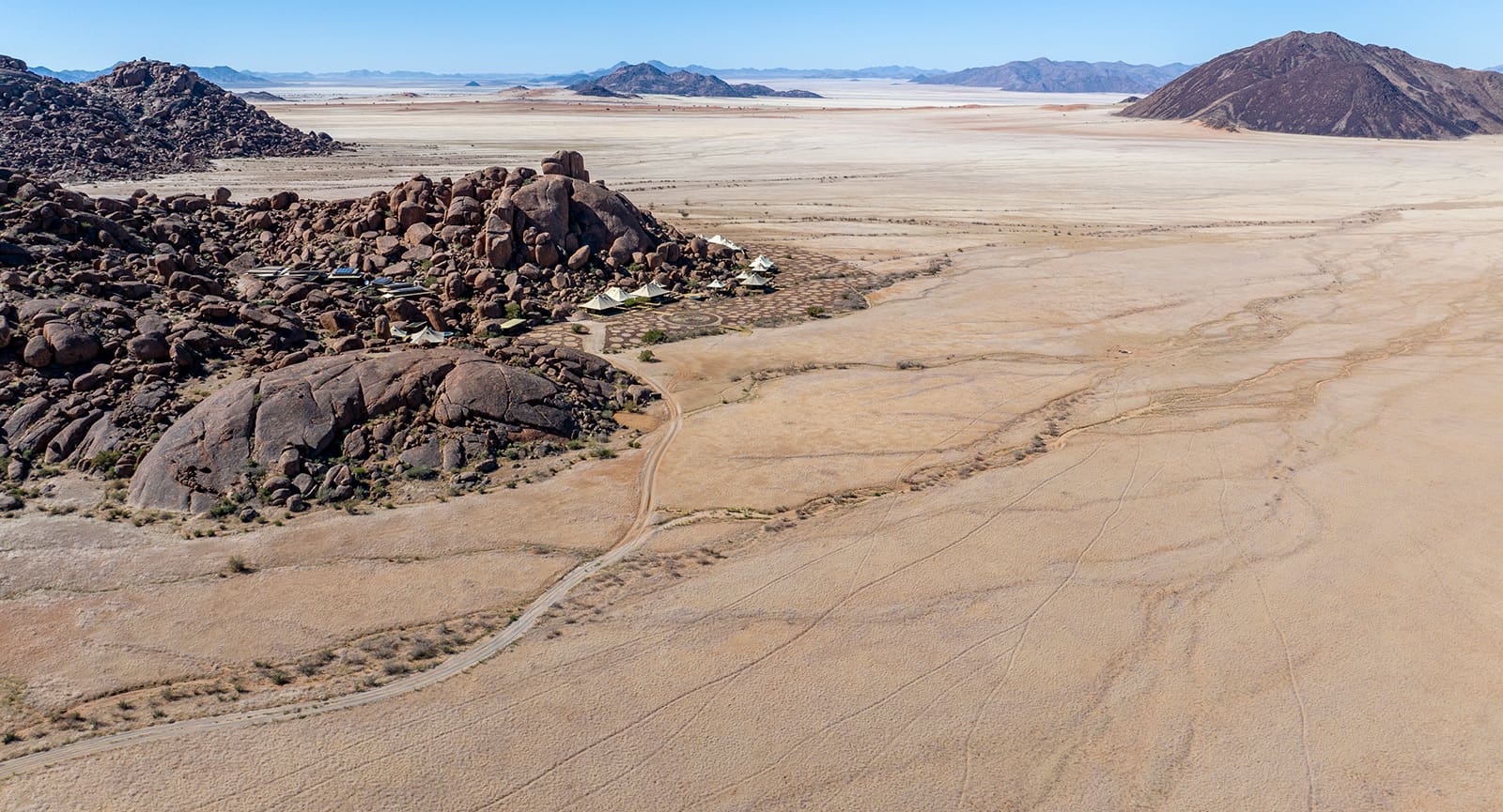 The camp’s position within this rocky landscape places guests in an area shaped by ancient geological formations and wide desert plains, reinforcing its reputation as the most classic Wolwedans camp.