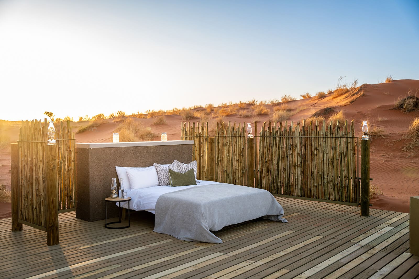 The Dune Camp & Dune Camp Private provide a more down-to-earth, yet stylish, experience. Positioned on the edge of a 250-metre high dune, it has an unparalleled natural charm. The spacious and comfortable tents are pitched on wooden platforms and include an indoor and outdoor bathroom. A generous deck with a ‘Wolwedans Chiller” (a small water filled silo for the hotter months) and a sleep-out for a night under the stars, facilitate a rather civilized camping experience.